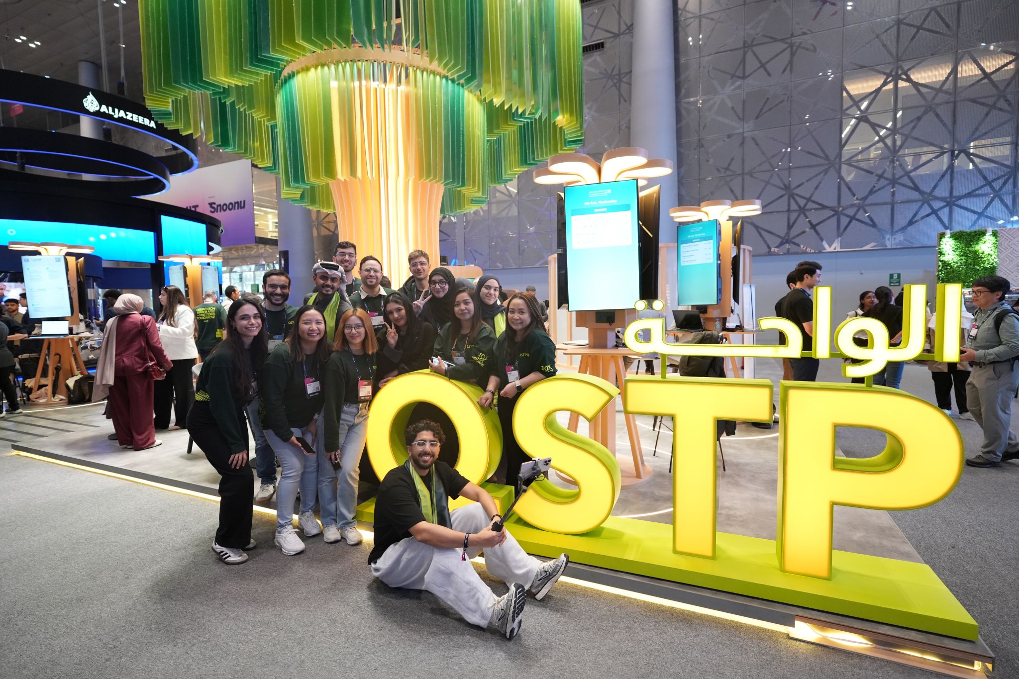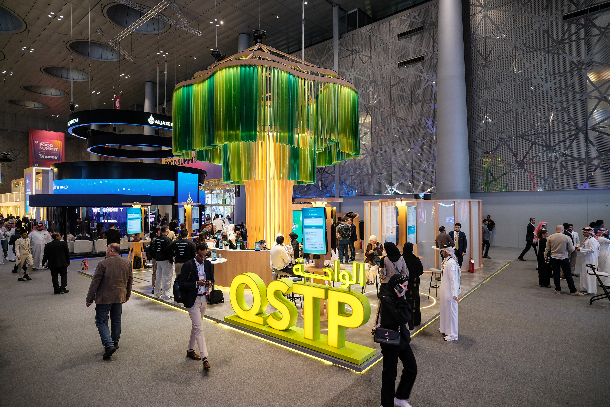 In an environment dominated by aggressive blue neon, glossy white plastics, and generic boxy structures, we designed a 12m x 12m spatial ecosystem anchored by a Living Data Tree — an iconic sculptural landmark symbolizing growth, incubation, and human connection. The booth replaced transactional tech aesthetics with warmth, hospitality, and immersive engagement, reframing QSTP as the convening force of the ecosystem.